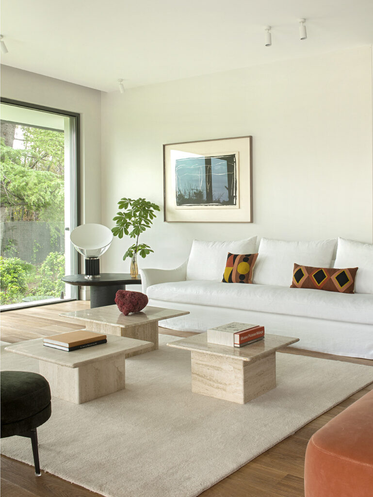 Los muebles y tejidos seleccionados se concibieron para crear un contraste vibrante con la paleta de blancos y crudos que define el espacio, al mismo tiempo que se integraban con el verde exuberante de las vistas. En el salón, se utilizaron tonos tierra, calabaza, rojo vino y verde, elegidos para cumplir con este propósito.