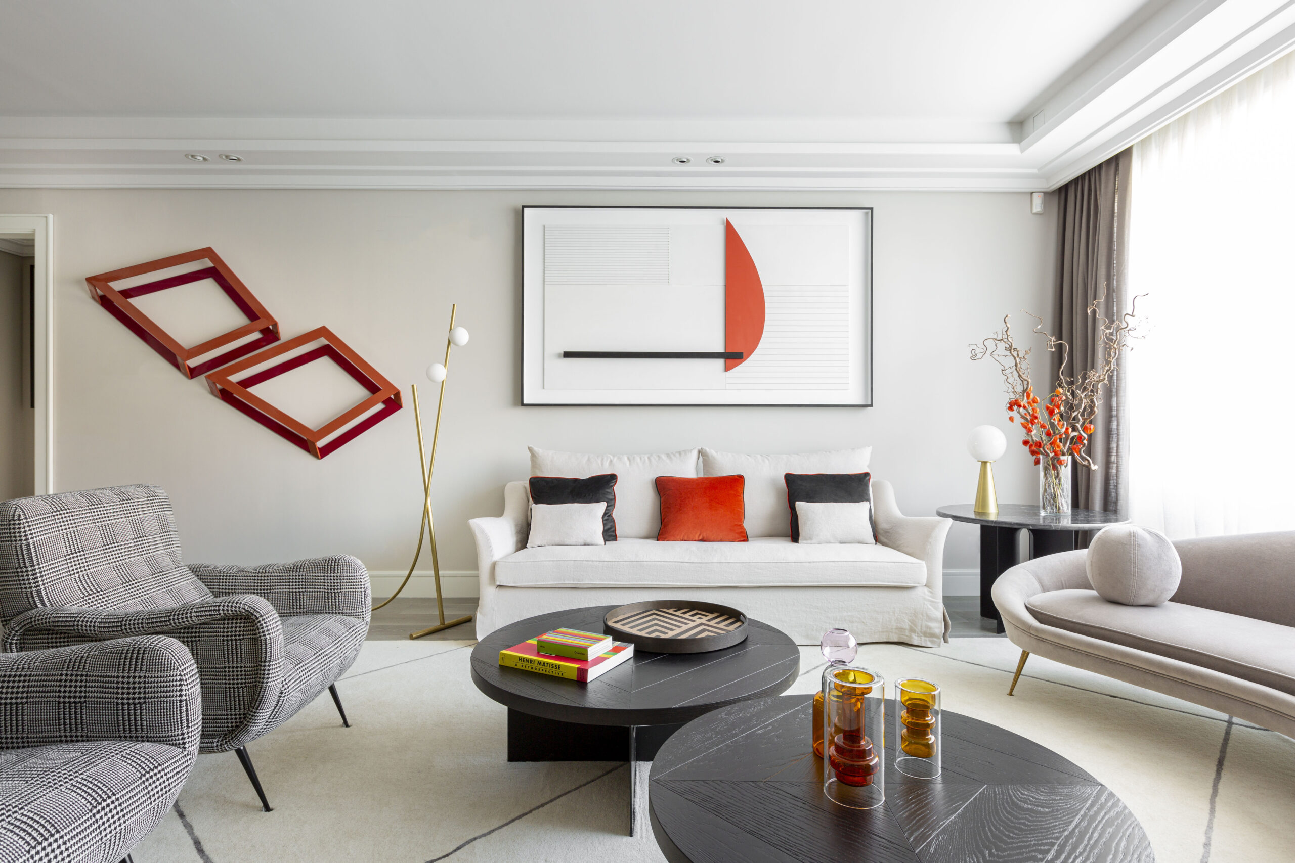 El apartamento, de 160 metros cuadrados, tiene el salón principal integrado con el comedor. Los sofás AVA con su almohadón esférico y Oda, ambos en tono blanco, se llevan el protagonismo del salón, acompañados a la perfección por la butacas Bogie en pata de gallo, una de las favoritas de de Nina “súper elegantes y comodisimas” agrega. En el dormitorio incorporaron la butaca Norah y la silla Shirley, también en tonos neutros para darle ese toque más acogedor.